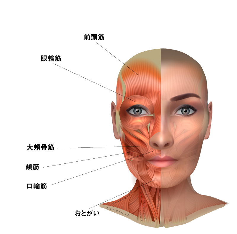 身体の筋肉は、骨と骨をつないでいますが、顔の筋肉は骨と皮膚につながっているため細やかな表情を作り出すことができます。