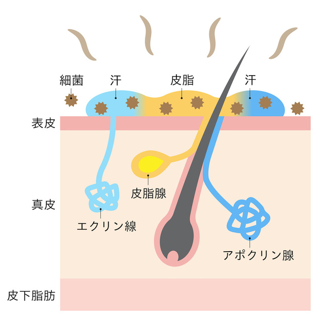 この皮脂は、皮脂線という毛穴に開口している器官から分泌されます。本来、毛穴から出て角質層の表面に広がり、水分の蒸発を防いで肌(皮脂)のうるおいを守る働きをします。