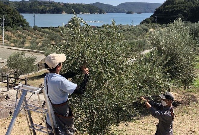 「エッセンシャルオリーブオイル」だけでなく、小豆島産製品として販売している、新漬けオリーブ・緑果オリーブオイル・化粧用オイルの3品全てに使用しています。一つの品種を熟度や品質別に分けて多様に生かすことができることから、3品を展開しているそうです。