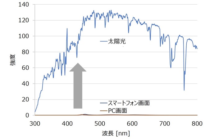 資生堂が調査した結果によると、太陽光中のブルーライトはスマートフォンや PC から発生するものと比較すると強度が数百倍にも渡ることが報告されています。