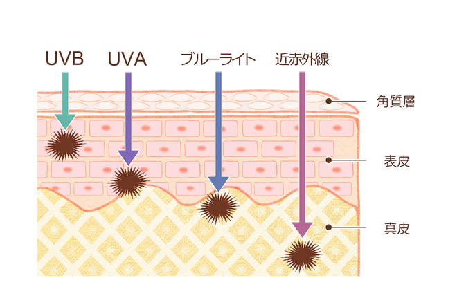 ブルーライトとは紫外線のUVAやUVBなどと同じように、肌の深層組織まで到達するため、肌のハリに重要なコラーゲンやエラスチン産生に影響を与える可能性があるのです。