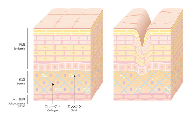 肌の中でコラーゲンはベッドのスプリングのような役割をしています。肌が押された際に押し返す力、皮膚の肌の弾力やハリにコラーゲンは非常に重要です。体内のコラーゲンは年齢とともにどんどん減少し、新しくコラーゲンを生み出す力も衰えてきます。年齢とともにシワや肌の張りがなくなっていく原因となってしまうのです。