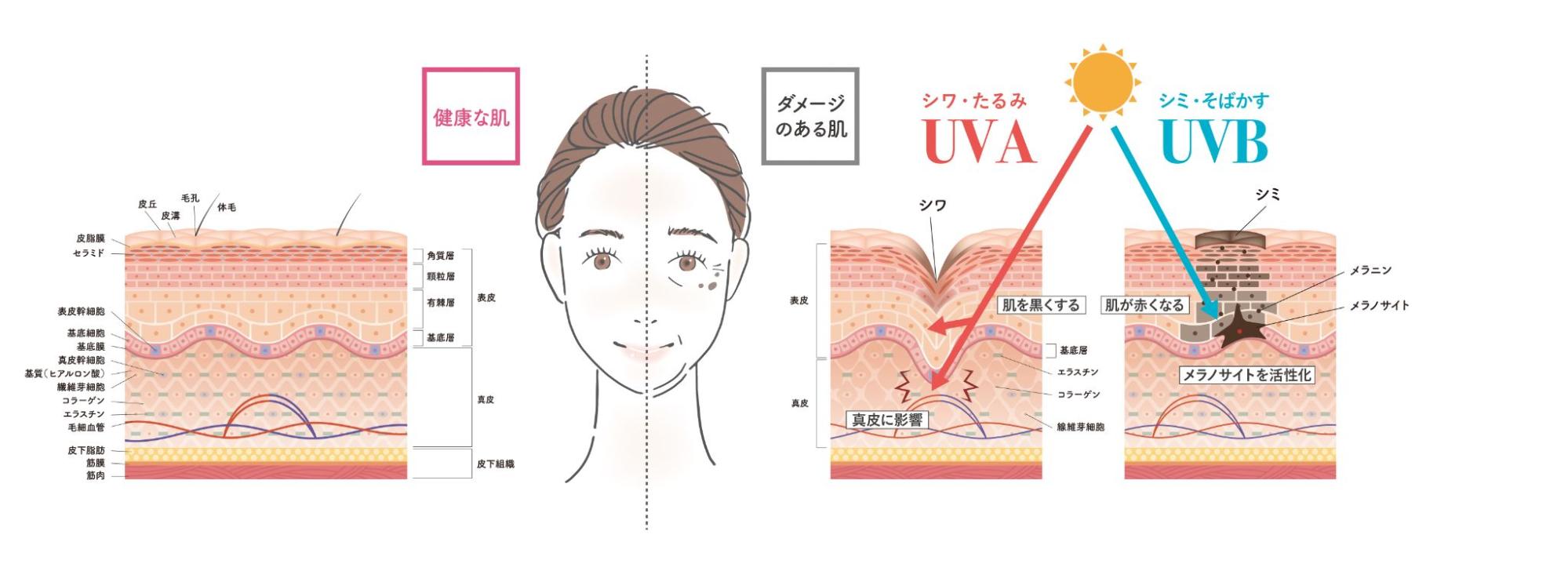 具体的には、紫外線が肌の深層部にダメージを与えることでしみやしわの原因となります。