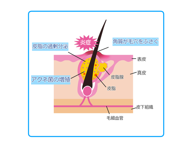 ニキビの原因は毛穴の詰まり、皮脂分泌の増加、アクネ菌の増殖などです。表皮の細胞はターンオーバーといって言って一定の周期で生まれ変わる機能があります。