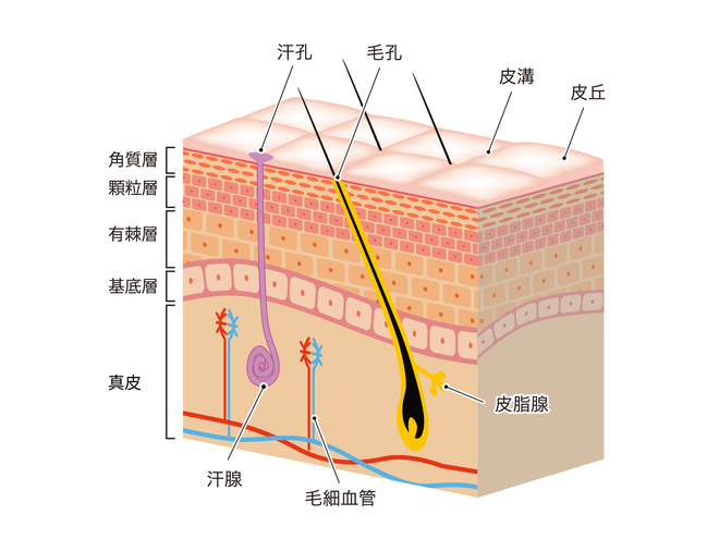 この「表皮」を詳しく見ると、「角質層」「顆粒層」「有棘層」「基底層」という4層に分かれます。化粧品の広告で肌の潤いを与えるという表現が見られますが、これは「表皮」の最も外側にある「角質層」まで美容成分を浸透させて効果を発揮するという意味です。