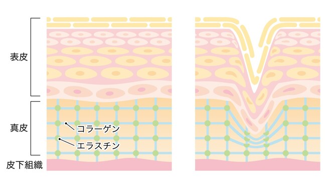 肌には「表皮」「真皮」「皮下組織」があり、弾力性に関係するところが真皮層です。真皮層には、コラーゲンやエラスチンから成るタンパク質の弾力繊維がありますが、老化や紫外線・ストレスなどの活性酸素により、これらが減少することで皮膚がたるんでしまいます。その他にも、摩擦や引っ張ったり、寄せたりすることもたるみの原因です。ほうれい線は、表皮のシワと異なり筋肉の溝です。ほうれい線(筋肉の溝)が影響している表皮のシワを放置していると深いシワになってしまうため、表皮のシワもケアしていくことは大事です。
