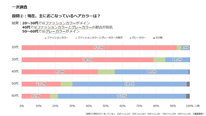 20代では90%以上、30代では80%近くがファッションカラーと回答。40代では、ファッションカラーとグレーカラーの両方と回答する人の割合が増え、ファッションカラーとグレーカラーのみの割合も拮抗。一方、50代、60代では70%前後がグレーカラーとの回答が得られた。