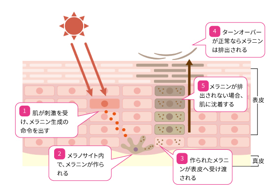 まず、紫外線などで肌が刺激を受け、メラノサイトにメラニン生成の指令が出されます。メラニンが作られ、メラニンが表皮に運ばれます。