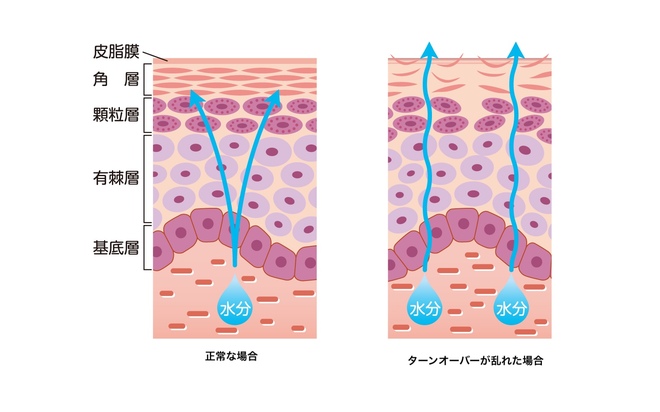 肌のターンオーバーの理想は28日周期です。しかし年齢を重ねるとターンオーバーが遅れ、肌のバリア機能も低下傾向に。その結果、肌の水分が逃げやすくなり乾燥による小ジワができやすくなります。