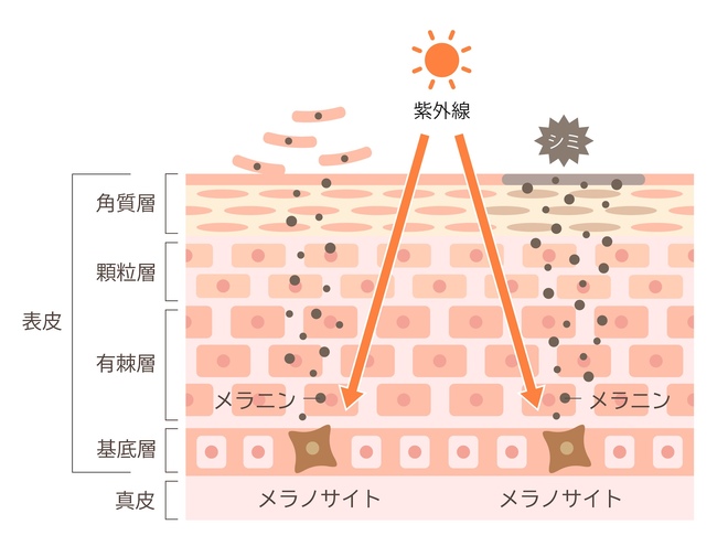 シミ・そばかすは表皮の基底層にあるメラノサイトが関与し、紫外線を浴びるとメラニンを生成します。作られたメラニンは表皮へ受け渡されシミの原因になりますが、ナイアシンアミドはこの受け渡しをブロック。 シミ・そばかすを防ぐ効果が期待できます。