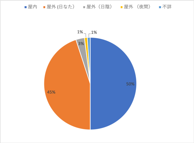 熱中症は夏の暑い屋外で起きるイメージがあると思うが、実際には屋内で熱中症になるケースが多い。室内でも無風の状態だったり、冷房をつけていない状態で、高温多湿な環境が続く室内にいると熱中症になってしまう可能性があることがわかる。