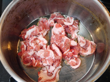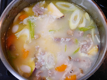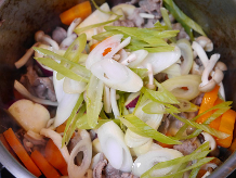 - 肉に火が通ったら、にんじん・(水切りした)さつまいも、しめじ、長ねぎの順に鍋に入れ、さらに炒める。