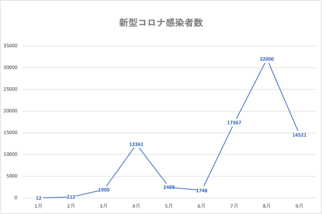 日本では2020年1月16日に最初の新型コロナウイルス感染症(COVID-19)の感染者が確認されてから、感染は全国へ広がっていきました。未だ収束の目処が立たない新型コロナの9月までの感染者数をまとめてみてみました。