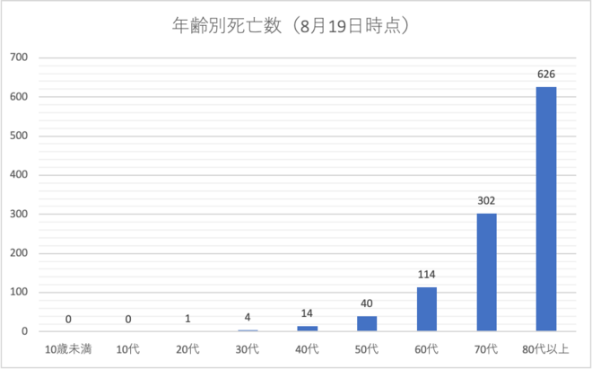 下記のグラフは8月19日に内閣官房が公表した年齢別の死亡者数です。年齢が高いほどリスクが高いことが伺えます。