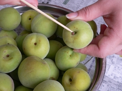 - 爪楊枝で梅のへたを丁寧に取り除きます。しっかり梅の水気をとておきます。