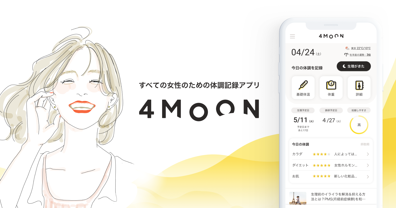 「4MOON(フォームーン)」は、月経周期により繰り返し変化する女性のカラダとココロに寄り添う無料の生理日管理/ヘルスケアアプリです。