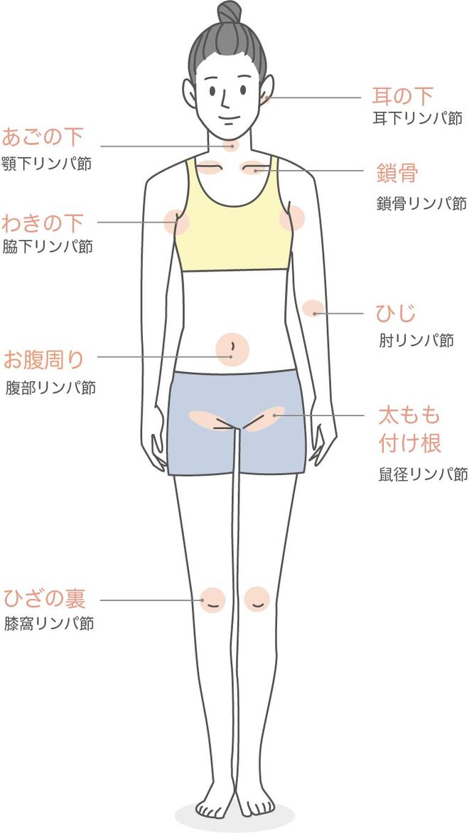 通常、リンパというと、全身を網の目のように張り巡らされている「リンパ管」、その管の中の流れている「リンパ液」、鎖骨や脇の下、脚のつけねの鼡径部、膝の裏などにある「リンパ節」を総称して言っていることが多いでしょう。