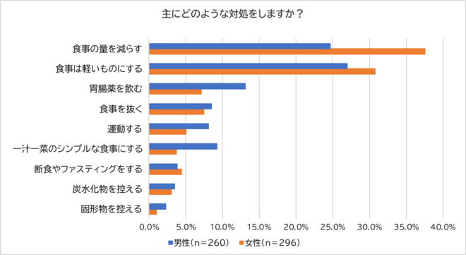 「する」と回答した男性260人・女性296人に「主にどのような対処をするか?」尋ねました。女性では「食事の量を減らす」(男性:24.6%、女性:37.5%)、男性では「食事を軽いものにする」(男性:26.9%、女性:30.7%)が最多となり、女性の7割弱が食事の量を減らしたり、軽くしたりすることで対処している結果となりました。一方、男性はこれら以外にも「胃腸薬を飲む」(男性:13.1%、女性:7.1%)や「運動する」(男性:8.1%、女性:5.1%)など、食事以外で対処している方も目立ちました。