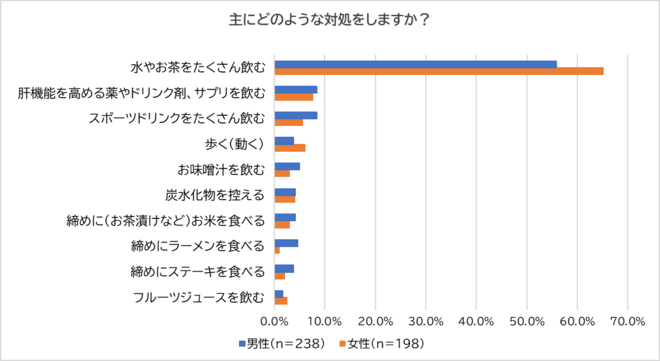 「する」と回答した男性238人・女性198人に「主にどのような対処をするか?」尋ねました。男女共に6割前後の人が「水やお茶をたくさん飲む」(男性:55.9%、女性:65.2%)と回答し最多となり、次点の「肝機能を高める薬やドリンク剤、サプリを飲む」(男性:8.4%、女性:7.6%)でも男女共に1割に満たない結果となりました。