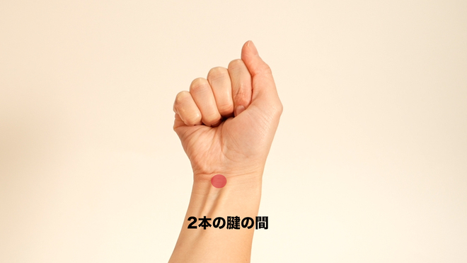 手のひらを上にして、手首にできる横シワの線上の中央。握り拳を握ると筋張る2本の腱の間。