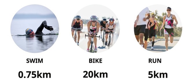 オリンピックディスタンスの半分の距離で、スイム0.75km・バイク20km・ラン5kmの合計25.75kmで行われます。