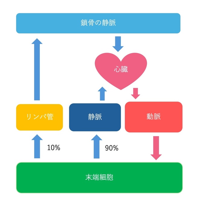 心臓から動脈を介して末端細胞へ血液は運ばれ、静脈を介して90%は回収されて戻ってきます。しかし10%は静脈で回収されずにリンパ管を経由して戻ってくるのです。