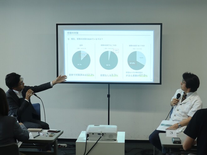 「老眼」の悩みも増えている大人化した社会に先んじて、メディア向けに眼科かじわらアイ・ケア・クリニック 院長 梶原 一人先生と眼鏡市場を運営する株式会社メガネトップ 商品部 マネージャー 積木 大輔さんを交えた“かくれ老眼の実態と対策”に関するラウンドテーブルが行われました。