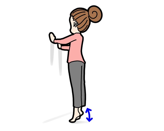立った状態で、かかとを上げてつま先立ちになる運動です。同じ姿勢が続く場合など、その場でできる運動なのでぜひ試してみてください!