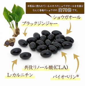 まずご紹介したいのは、ブラックジンジャーの高純度粉末を使用した健康維持・美容のためのハイエンドサプリメント「ブラックジンジャーカプセル」。機能性表示食品としても受理されているサプリメントです。有効成分であるポリメトキシフラボンやL-カルニチンの働きにより日常活動時でも脂肪分解・燃焼効果が認められ、ダイエットやリバウンドの抑制に効果的です。また、ショウガオールや共役リノール酸(CLA)、バイオペリンなども配合されているので、美容と健康を追求する方には心強いサプリですね。