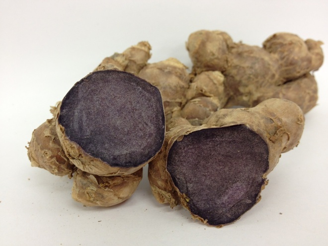 見た目は日本のショウガとほぼ一緒なのですが、切ってみると中は紫がかった黒色をしています。苦みが強くクセがあるため、そのままそのまま食べるには不向きですね。