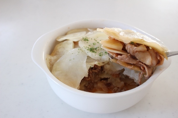 - 耐熱皿に①のじゃがいも、②の豚肉を重ね、4層にする。