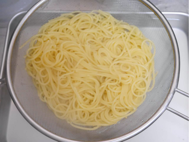 - スパゲッティが茹であがったら、麺をザルに移し、水気を切る。