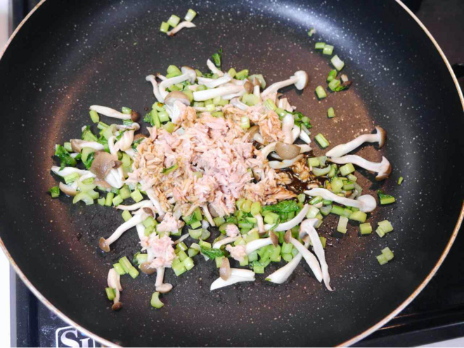 - 油が馴染んできたら、ツナ缶・バターを加え、均一になるように炒め混ぜる。