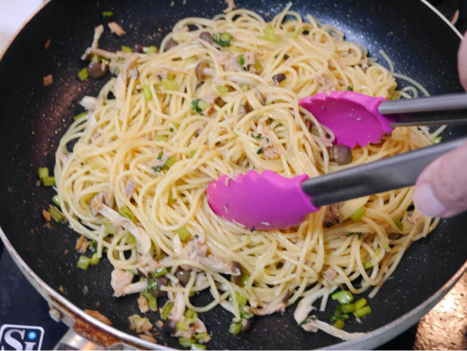 - ソースを作ったフライパンの中に1の麺を加え、火にかけながら麺をソースに絡める。※この時、パスタのゆで汁で水分調整をして下さい。