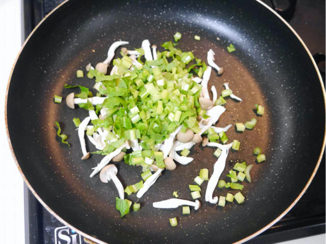 - フライパンに油をひき、①のカブの葉・②のしめじを入れ、炒める。