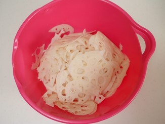 - 蓮根の皮をむき、スライサーでスライスする。