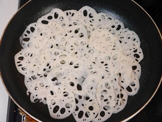 - ①の片栗粉をまぶした蓮根をフライパンに敷き詰める。蓮根に焦げ目がつくまで中火で焼き、裏返す。