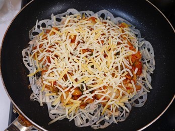 - さらにキムチ、その上にピザ用チーズを散らし、中火で3~4分加熱する。(※チーズが溶けたらOK!)
