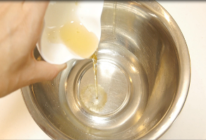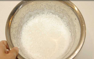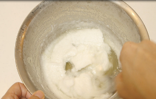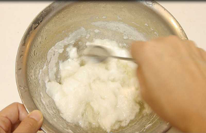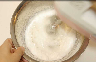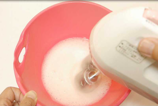 - 別のボールに卵白を入れ、角が立つまでしっかり泡立てる。