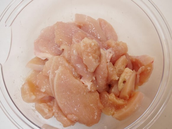 - ボールに鶏ムネ肉スライスを入れ、塩麴につけておく。