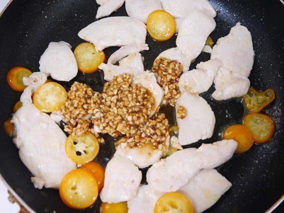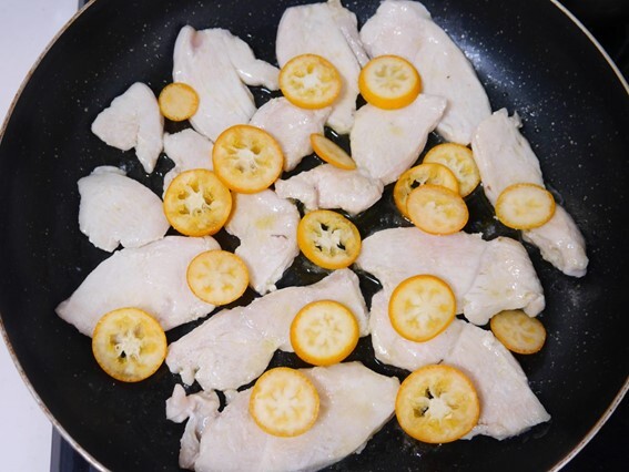 - 鶏肉に火が通ったら、③のスライスした金柑を入れて軽く炒める。