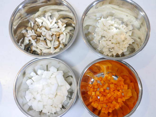 - だいこん、にんじん、れんこんは角切り、しめじはバラバラにほぐす。(それぞれ食べやすい大きさに切る。)