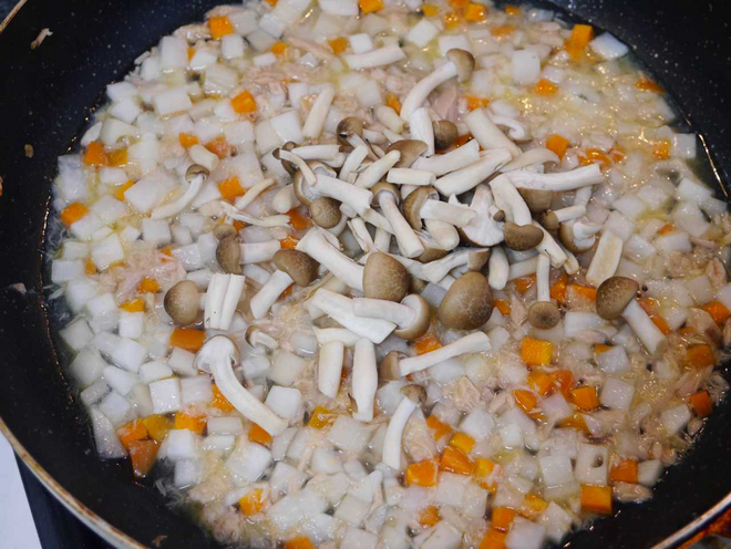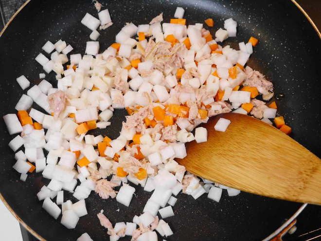 - フライパンにツナ・だいこん・にんじん・れんこんを入れ、炒める。(ツナ缶は軽く油を切っておく)