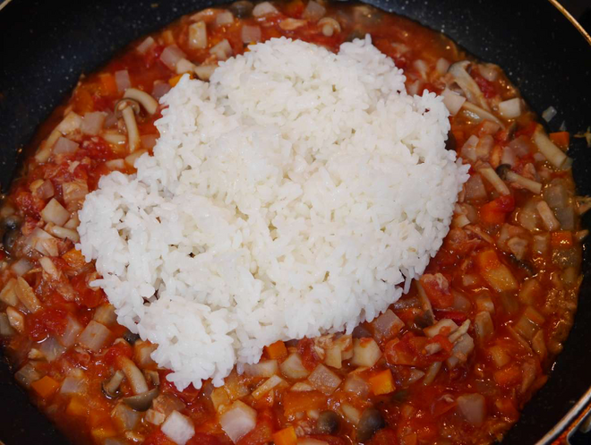- 煮立ったらごはんを加え混ぜる。