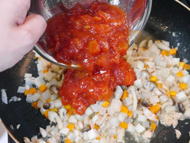 - 火が通ったらトマト缶、麺つゆ・みそを入れ、ひと煮立ちさせる。