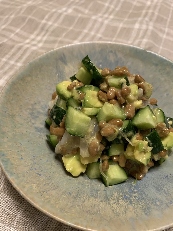納豆の健康効果として血栓症の抑制や骨粗しょう症予防、アレルギー抑制作用などは有名ですが、お肌や髪を美しく保つアンチエイジング効果も報告されています。今回はこの納豆を使った定番料理「イカ納豆」にアボカドとキュウリを加えました。作り方は刻んだ食材を混ぜるだけ。そのまま食べてもおいしいし、卵黄やお好みの食材をトッピングするのもあり。パスタと和えるのもオススメです。