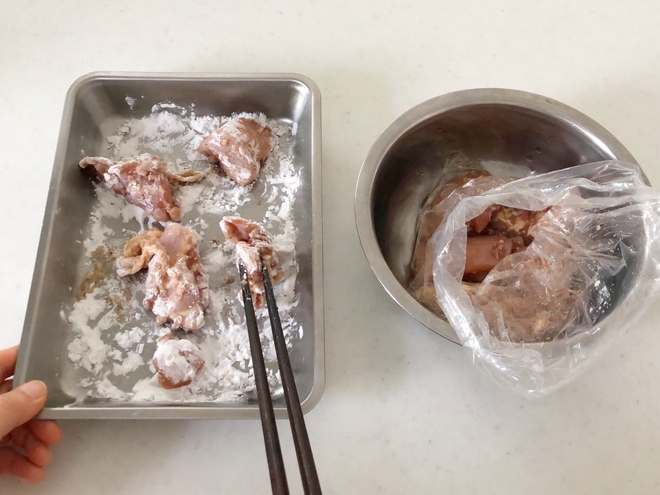 - バットに片栗粉を振るい入れ、1の鶏肉を両面まんべんなく、粉をつける。