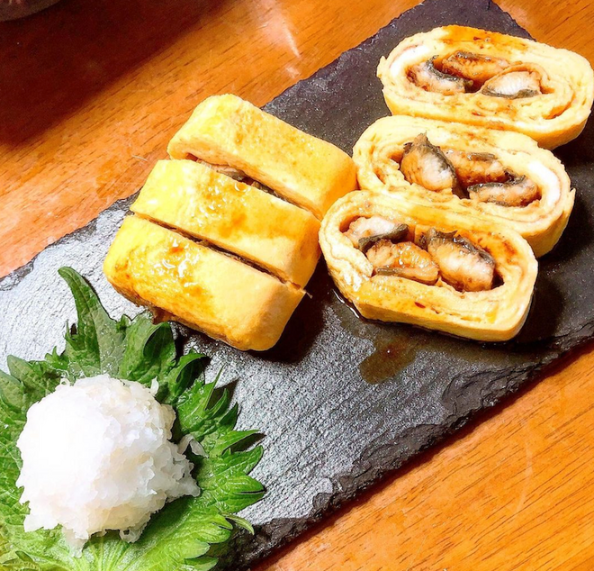 - 熱した卵焼き器に卵液を一部入れ、全体に広げます。一番奥にうなぎを2枚重ねるように並べ、端から卵を巻いていきましょう。