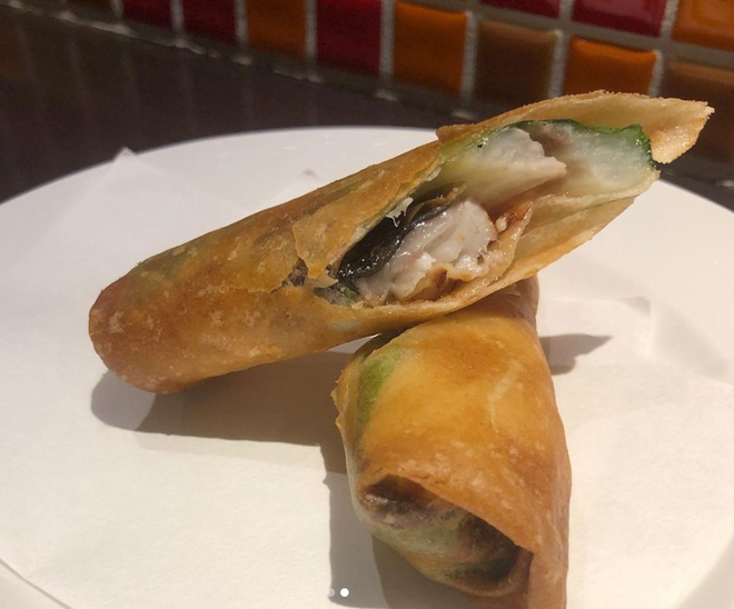 - 春巻きの皮を広げ、うなぎとチーズを1/4量乗せて巻きます。