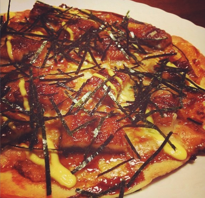 - ピザ生地にマヨネーズを塗り、ピザ用チーズ、うなぎの蒲焼を乗せます。